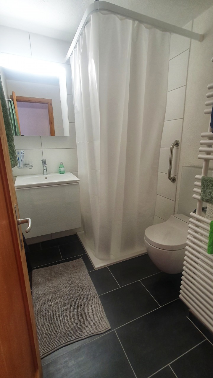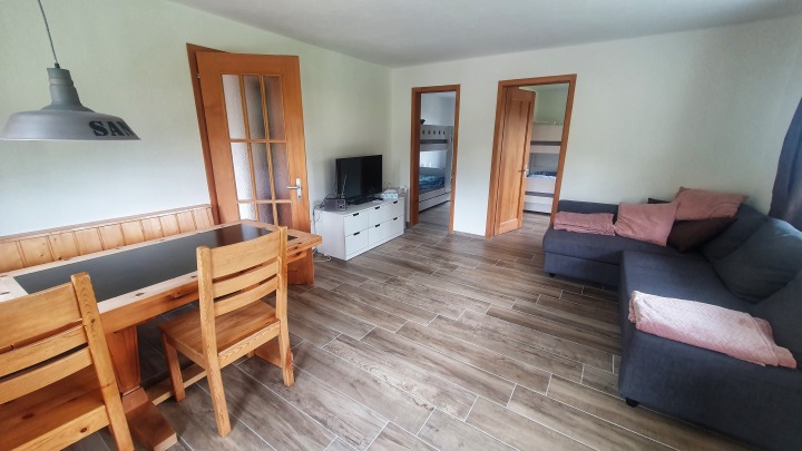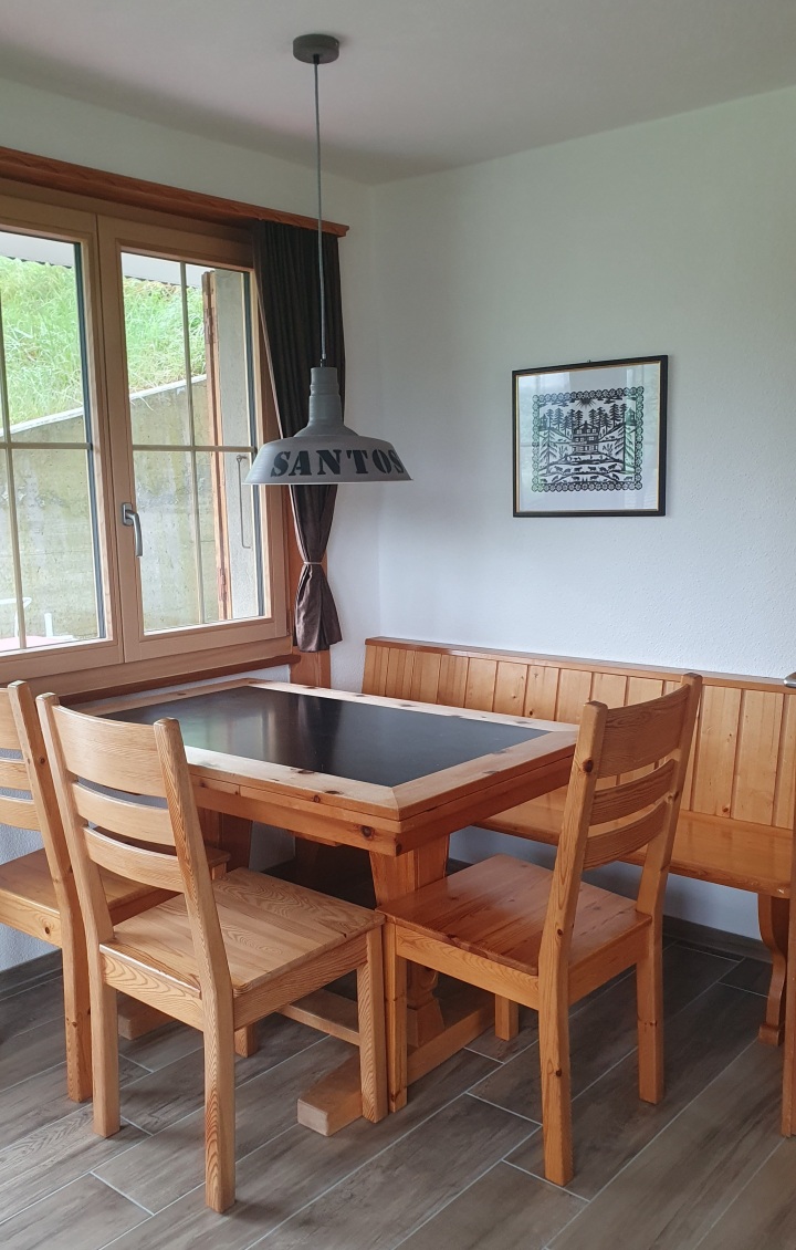 Die Wohnung hat ein Schlafzimmer mit einem Doppelbett, das andere Schlafzimmer ist ausgestattet mit einem Stockbett und einem Einzelbett. In der Wohnstube kann das Sofa zusätzlich zu einem Doppelbett umgebaut werden. Die Wohnung verfügt über ein kleines Badezimmer mit Dusche und einem AquaClean Dusch-WC. Die kleine Küche welche 2025 ersetzt wurde ist für 8 Personen ausgelegt und hat einen Backofen, ein Glaskeramikfeld, eine Abwaschmaschine und einen Kühlschrank mit kleinem Gefrierfach. Der eigene Bodenebene Keller-Raum ist praktisch für Stau- und Skiraum. Geheizt wird mit einer Luft-Wärmepumpe.